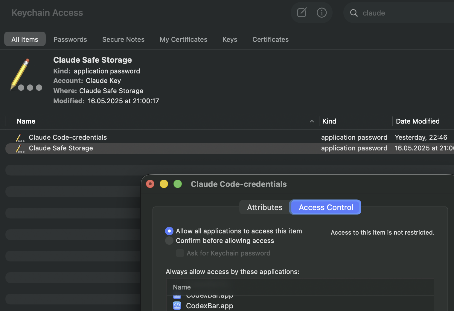 - Open Keychain Access.app → login keychain → search the item (e.g., “Claude Code-credentials”).